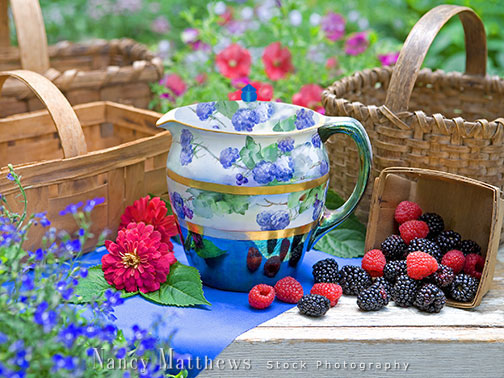 Description: teapot with baskets and raspberries
