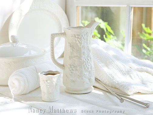 Description: pitcher with knitting and a coffee cup