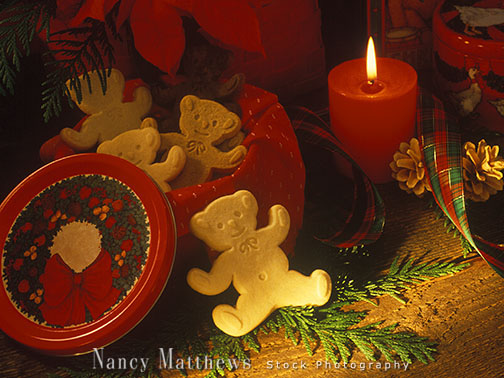 Description: teddy bear cookies in a tin with a candle and poinsettias