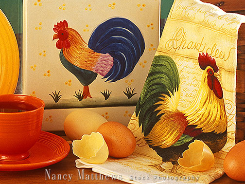Description: roosters with eggs in a window