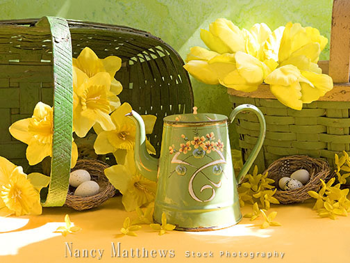 Description: teapot with spring flowers and nests