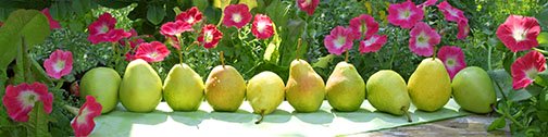 Description: row of pears with petunias
