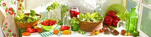 Description: salad bowls and produce by a window