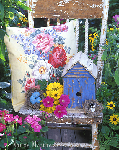 Description: blue birdhouse on chair