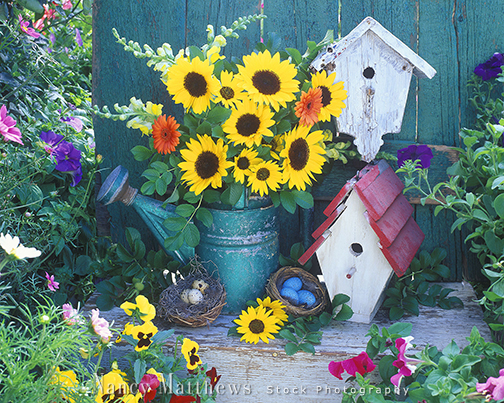 Description: watering can and birdhouse on bench