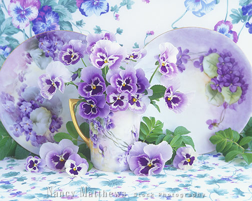 Description: lavender pansies with hand painted china