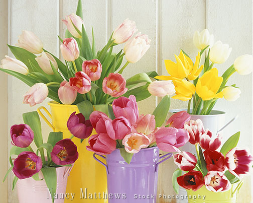 Description: tulips in colorful tins