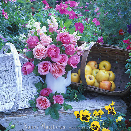 Description: pink roses with a basket of apples