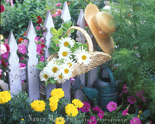 Description: basket of daisies on a picket fence with a watering can