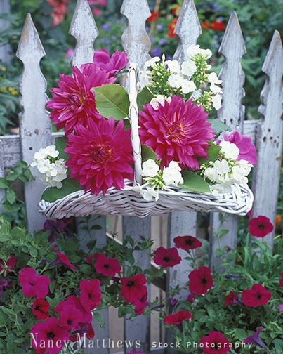 Description: basket of dahlias on a picket fence