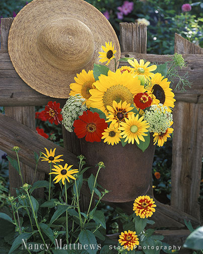 Description: bucket of flowers with a garden hat