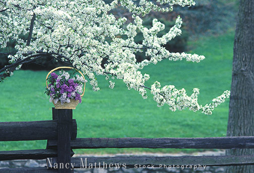 Description: lilac basket on a fence with a flowering tree