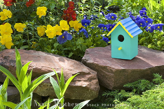 Description: green birdhouse in a rock garden