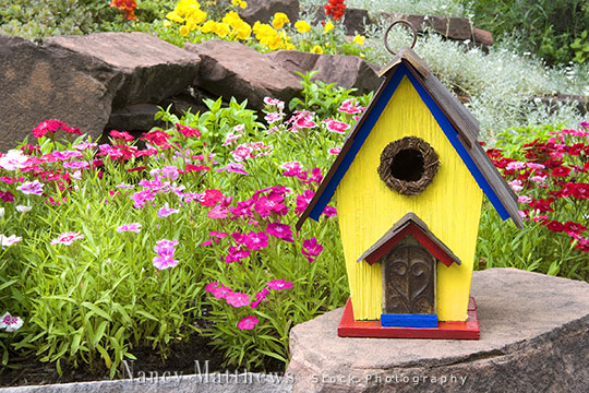 Description: yellow birdhouse in a rock garden