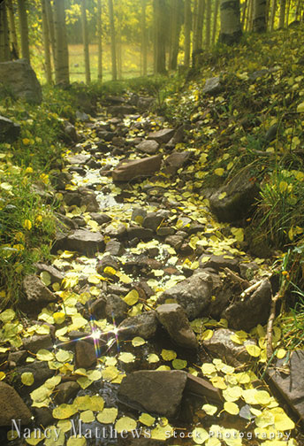 Description: fallen aspen leaves in a creek bed
