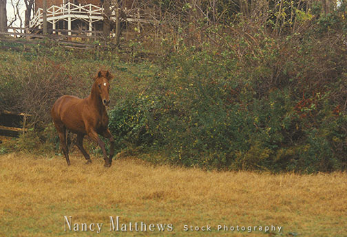 Description: running horse on a farm
